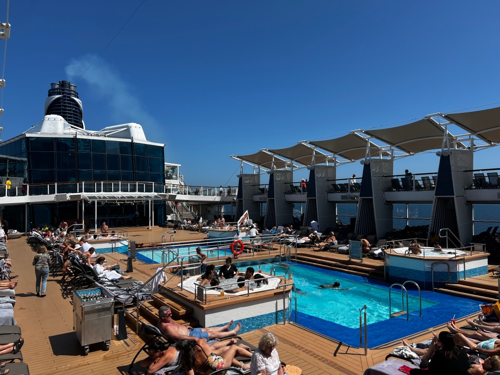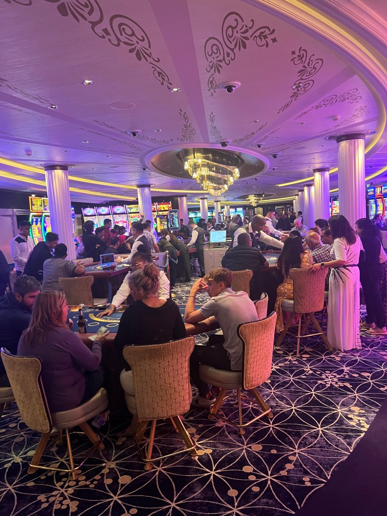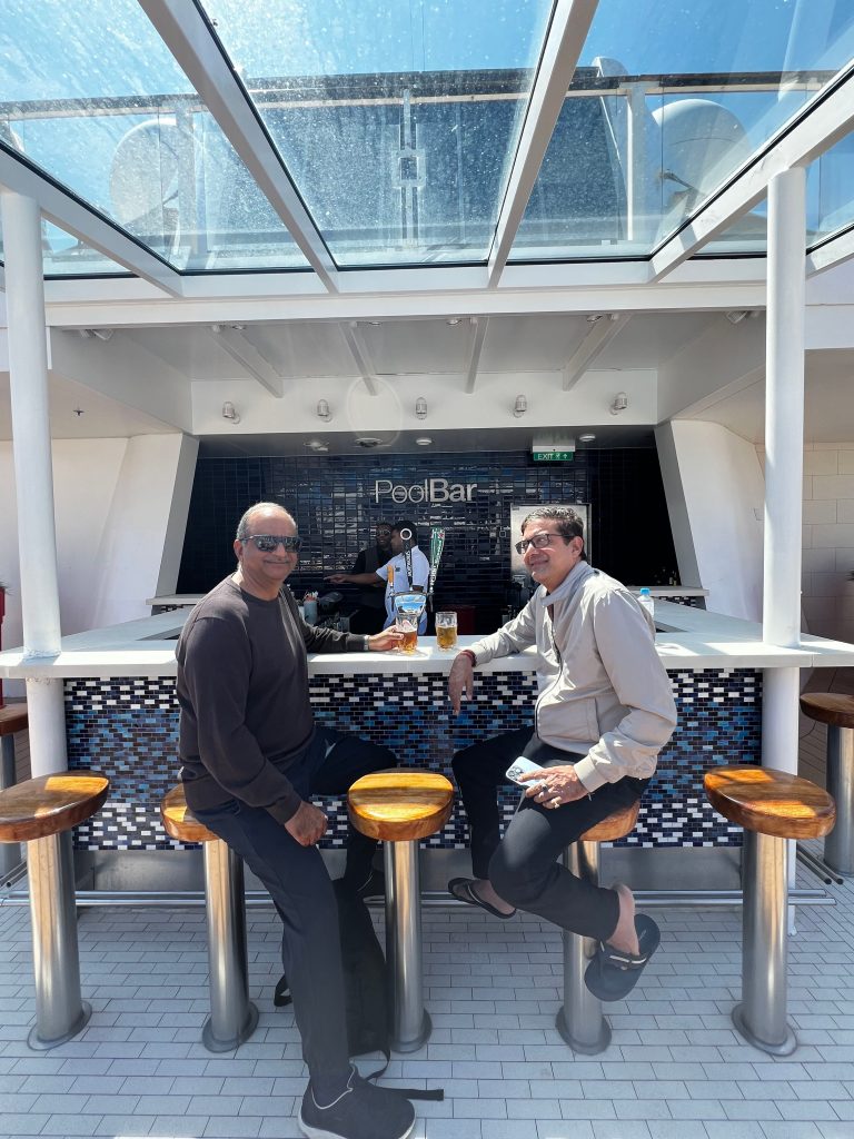 As I mentioned earlier – there was a bar everywhere. This is a big money spinner as you are not allowed to get booze from outside. The luggage is X Rayed and even hand luggage is scanned at each port once you come back. A lot of bar guys were Indians and they were kind enough to give me a generous pour once they realised that I was without a drinks package. With Euro 2024 in full flow the sports bar and celebrity bar were very popular as they had TV screens. As sun was setting past midnight – you could feel that it was night if you came to lower floors as they had covered the windows . If you did want to enjoy the views till late at night then sky lounge on 12th floor was perfect.