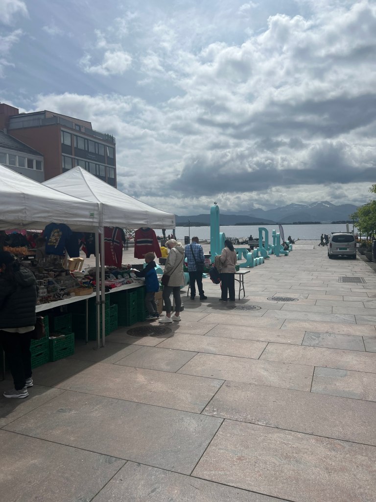 Molde : Our first stop was here. One can just walk along the sea shore for 15-20 minutes to reach the city centre. There are 2 things you can do here. Go up to a peak called the Varden and enjoy the views or drive to the picturesque Atlantic Ocean road. We didn’t hike up to the Varden (many people do it) but went by bus and taxi. I mean some went by bus and some by taxi as bus had only a few seats left. This we did from city centre without any prior booking. Atlantic ocean road is a bit further so we avoided that though I am told that it is a great drive. There was enough beauty to be seen from the ship and the peaks of Molde. Molde did have a mall in city centre and realising that I will need some more clothes I did buy some stuff from there. There was a Thai restaurant in the town so we decided to have a leisurely lunch here.